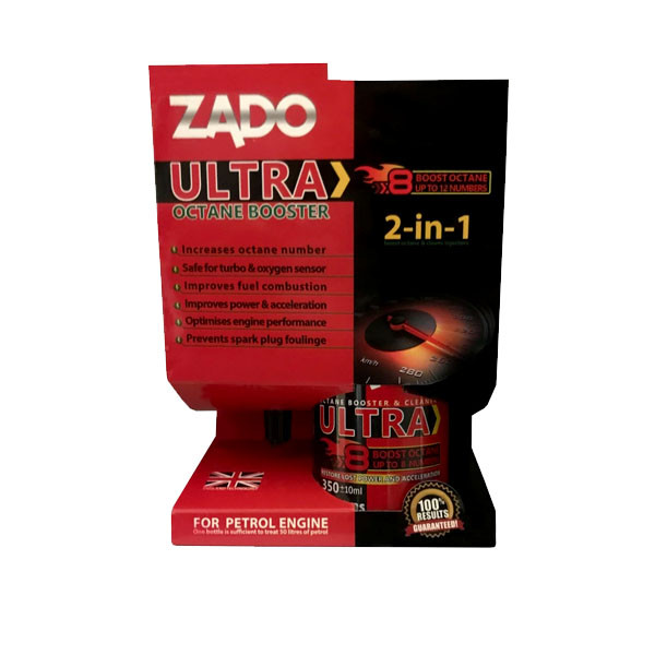 اکتان بوستر الترا زادو با حجم 350 میلی لیتر یک افزودنی چند منظوره برای سوخت بنزین است. این محصول به منظور جلوگیری از احتراق زودرس که در سوخت بنزین با اکتان پایین متداول است فرموله شده و به موتور در تمام موقعیتهای حرکت و شتاب کمک میکند. این محصول مصرف جهانی داشته و عدد اکتان سوخت را با توجه به نوع بنزین تا 8 واحد افزایش میدهد. اکتان بوستر الترا زادو تحت لیسانس و فرمولاسیون انگلستان تولید میشود. با توجه به کیفیت بسیار بالای محصولات زادو علاوه بر نشان استاندارد ملی, توانسته است استاندارد CE اروپا, ایزو9001, ایزو14001, ایزو18001 بین المللی را نیز کسب نماید که بر روی محصول درج شده است. اکتان بوستر زادو مایعی است که با ساختار هیدروکربنی به همراه مواد شیمیایی مناسب, میتواند علاوه بر حلالیت کامل در ماده خوراک اصلی بنزین و افزایش درجه آرام سوزی یا عدد اکتان, نه تنها اثر سویی بر دیگر پاارامترهای کیفی نداشته بلکه باعث بهبود و موجبات افزایش احتراق کاملتر در سوخت خواهد شد. افزایش عدد اکتان منجر به عملکرد بهینه موتور و کاهش عدد سوخت میگردد و در نتیجه افزایش عملکرد سوخت, از آسیبهای موتور که در اثر عملکرد نامطلوب سوخت ایجاد میشود مانند ضربه موتور جلوگیری خواهد شد. ضربه موتور یا ناک (knock) صدایی است که در اثر احتراق پیش از موعد مخلوط سوخت-هوا در سیلندر خودرو ایجاد میشود. استفاده از اکتان زادو به مقدار مناسب میتواند به عملکرد درست خودرو کمک کند و احتمال آسیب دیدن موتور را به دلیل ضربه کاهش دهد. این محصول برای مخزن 50 تا 60 لیتری بنزین و بیشتر برای خودرو های داخلی و برای هر بار سوختگیری توصیه میشود و به دلیل فرار بودن اکتان به محض باز شدن درب قوطی بایستی استفاده شود و نمیتوان بخشی از آن را برای استفاده در باک بعدی نگه داشت.