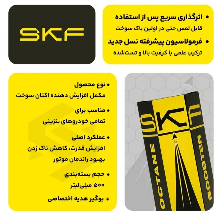 اکتان بوستر SKF علاوه بر بهبود فرآیند احتراق و افزایش راندمان، مانع از ناک موتور شده و طول عمر سیستم سوخترسانی را افزایش میدهد